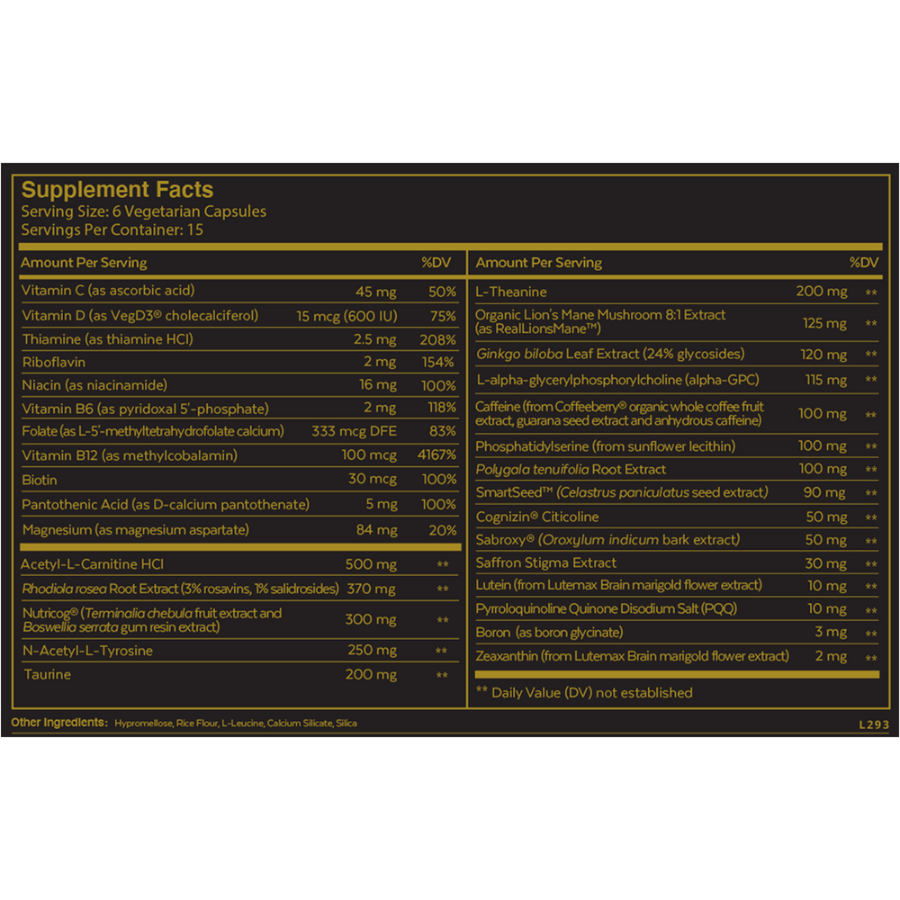 - Nootrópicos premium: Bacopa Monnieri, Lion's Mane, Rhodiola Rosea